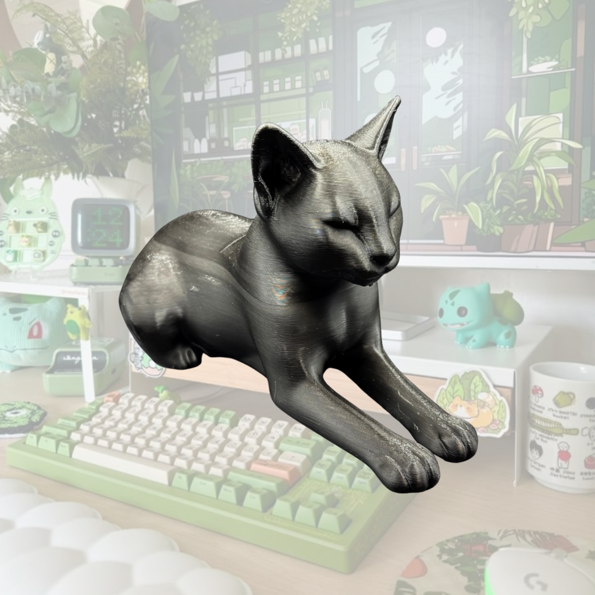 Виготовлений із міцного PLA-пластику, цей лежачий кіт стане стильним акцентом на полиці, столі або підвіконні, а також чудовим подарунком для любителів котів та сучасної естетики.