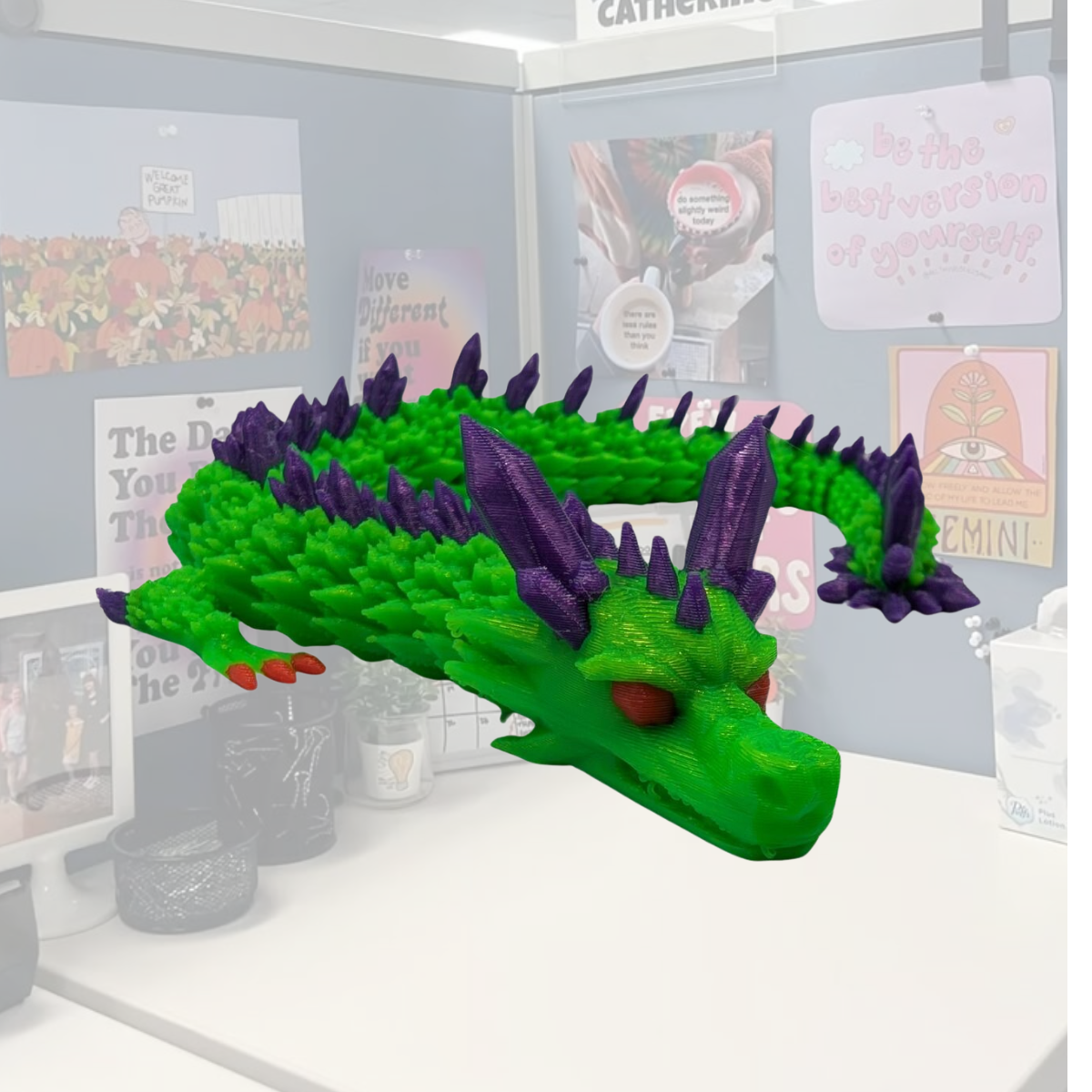Кристальний дракон — це магічне поєднання технології та фантазії, втілене у 3D-друці з екологічного PLA пластику. Салатове тіло виблискує свіжістю життя, а фіолетові кристали втілюють силу духу, мудрість та внутрішню гармонію. Цей дракон — не просто іграшка-антистрес, а символ захисту, трансформації та натхнення.