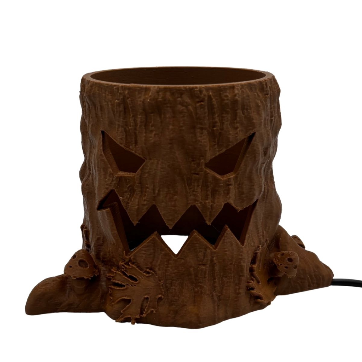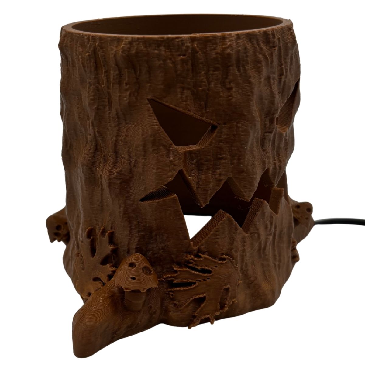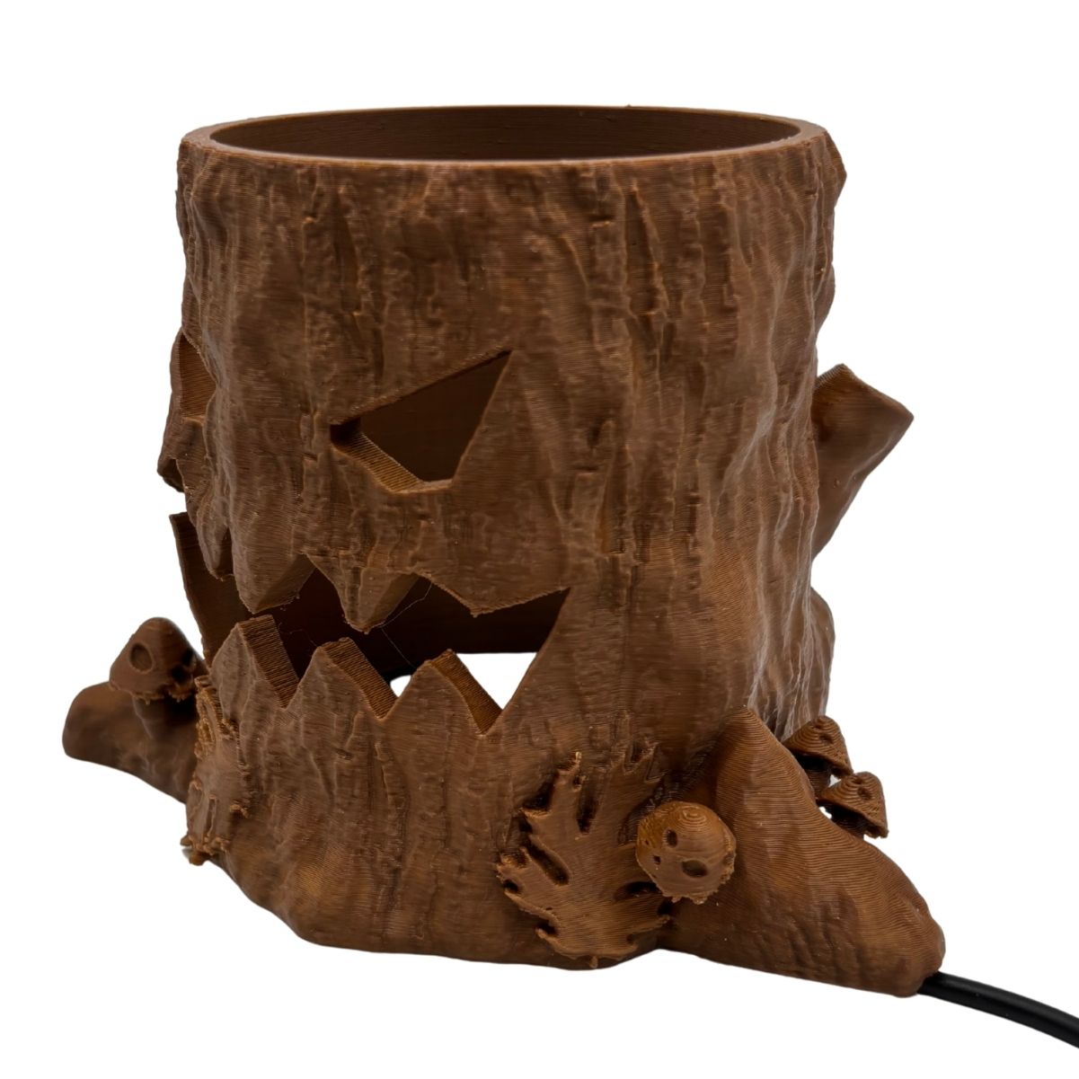 Виготовлена з PLA-пластику на 3D-принтері, лампа поєднує деталізовану текстуру дерева та міцність сучасних матеріалів. При ввімкненні вона випромінює м’яке світло крізь вирізані отвори, створюючи атмосферу містики та загадковості.
