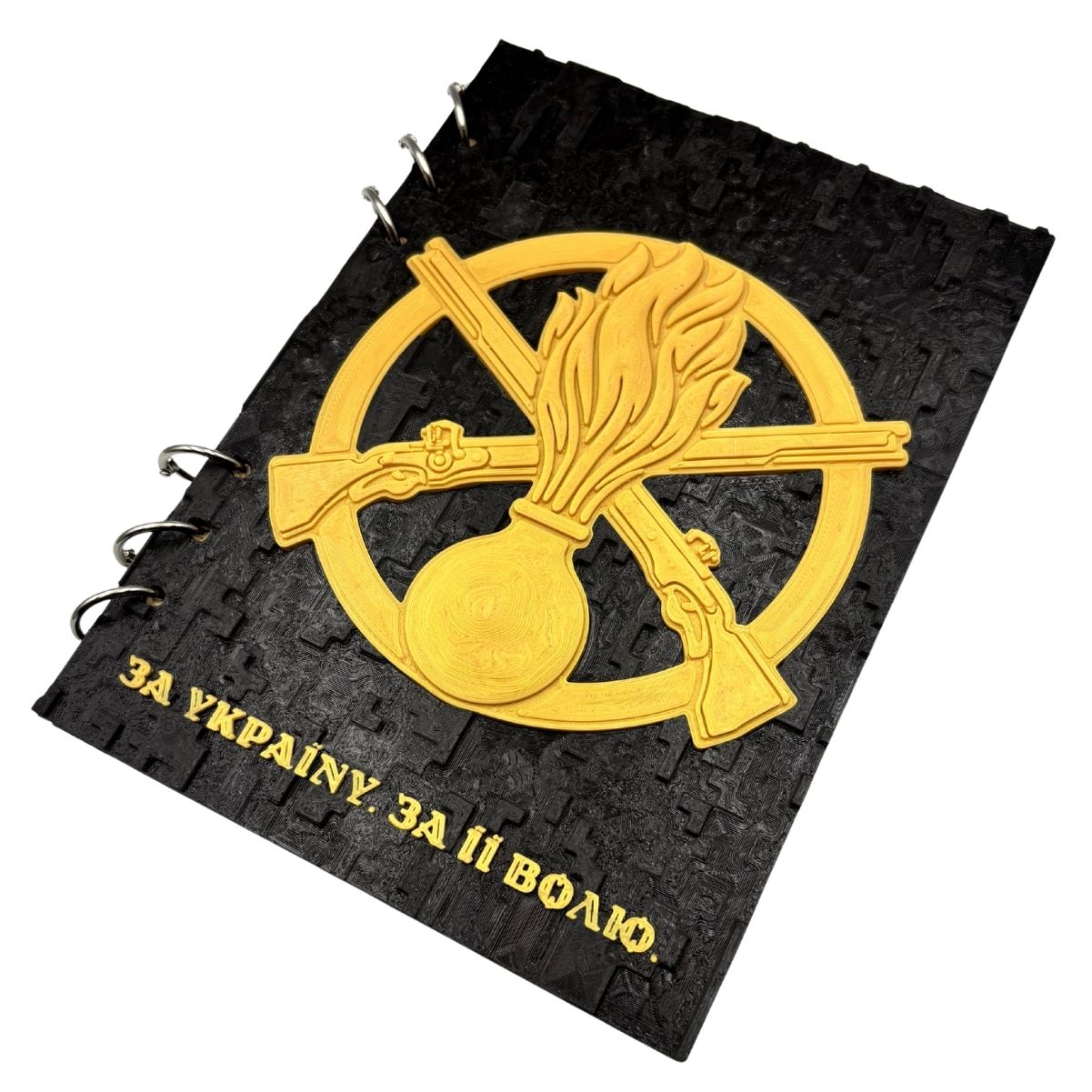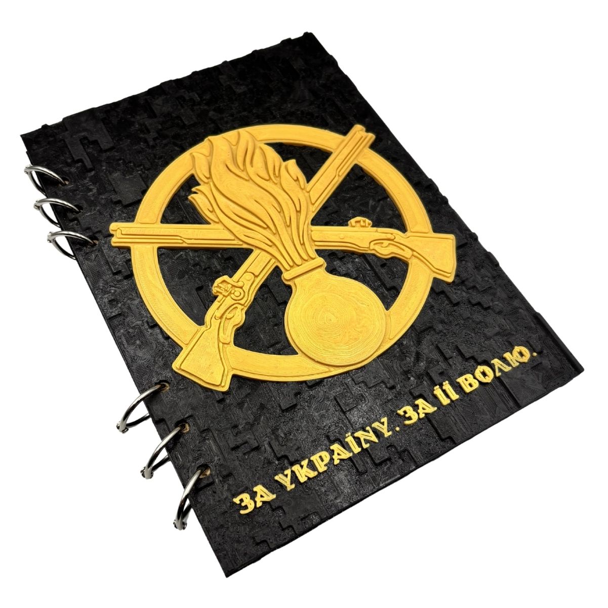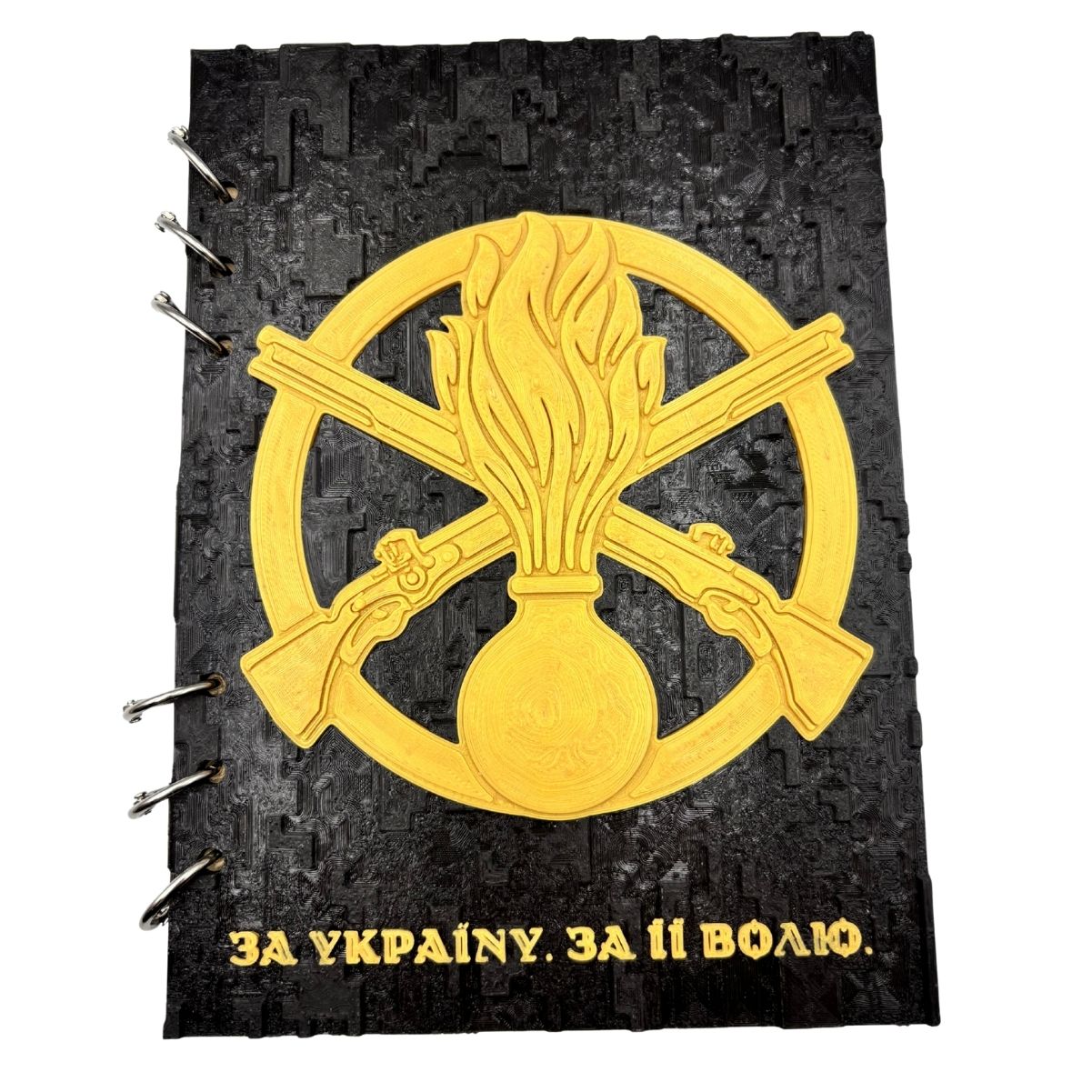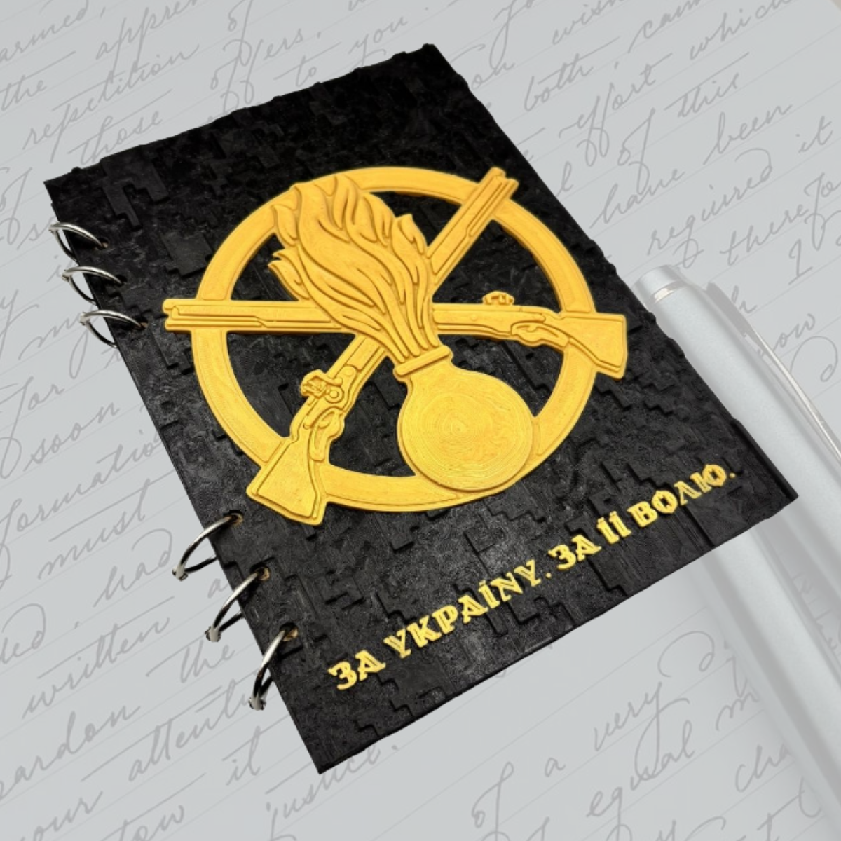 Стильний та символічний блокнот “Механізовані війська” створений для справжніх захисників і патріотів. Його обкладинка виготовлена на 3D-принтері з міцного PLA пластику та прикрашена емблемою механізованих військ України та написом «За Україну. За її волю.»